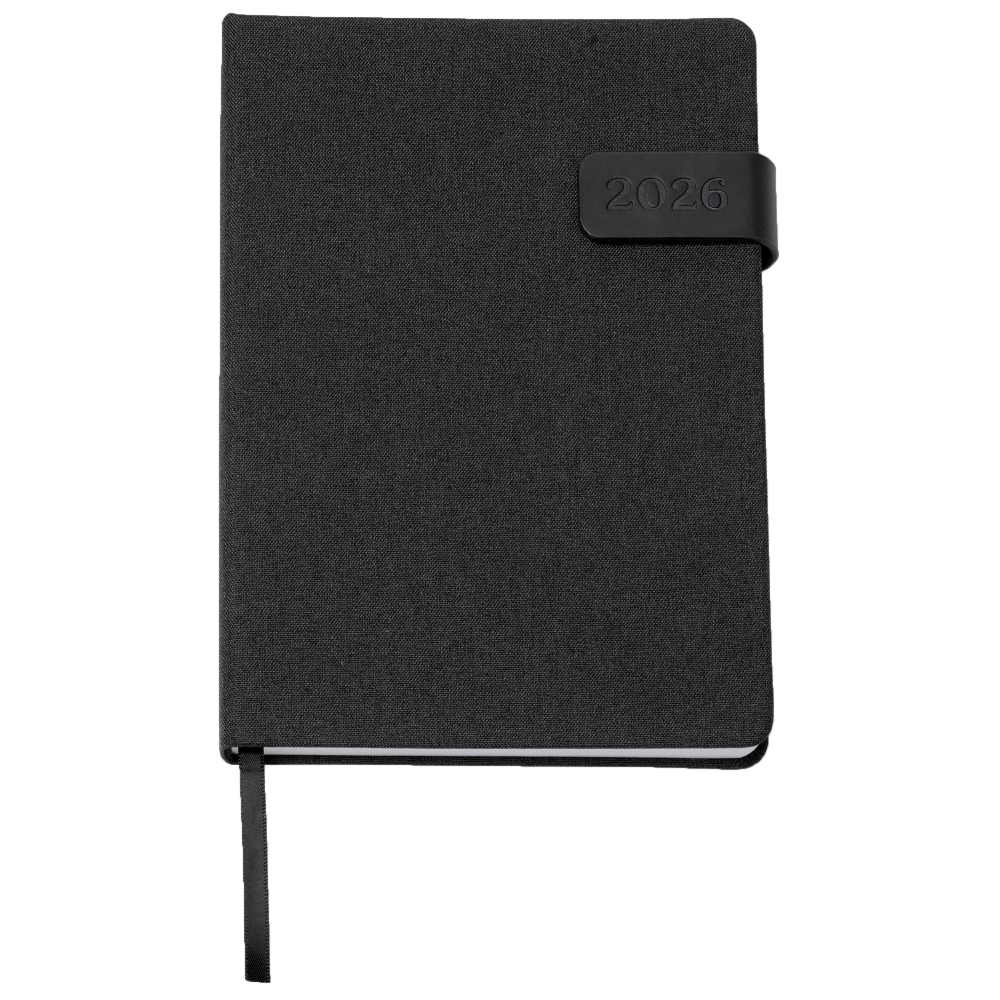 Agenda tamaño A5 realizada con poliéster reciclado RPET con cubierta magnética. 320 páginas más 4 páginas con mapas. Marcador de páginas en color a juego con la portada. Papel interior de color blanco.