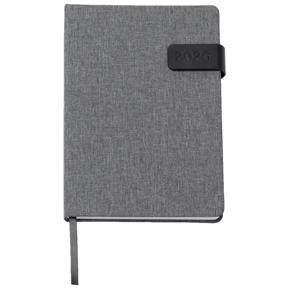 Agenda tamaño A5 realizada con poliéster reciclado RPET con cubierta magnética. 320 páginas más 4 páginas con mapas. Marcador de páginas en color a juego con la portada. Papel interior de color blanco.