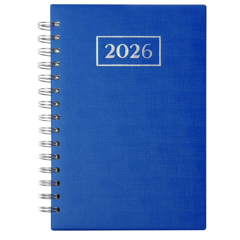 Agenda de anillas 2026 tamaño A5 (15 x 21 cm), diseño página día con esquinas troqueladas. Tapas de PU acolchadas con grabado bajo relieve. 348 páginas más 4 páginas con mapas.