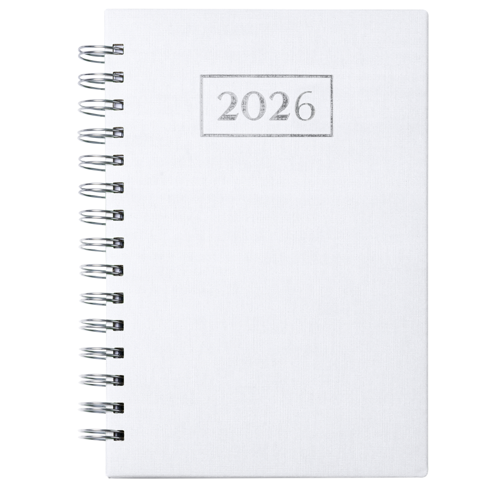 Agenda de anillas 2026 tamaño A5 (15 x 21 cm), diseño página día con esquinas troqueladas. Tapas de PU acolchadas con grabado bajo relieve. 348 páginas más 4 páginas con mapas.