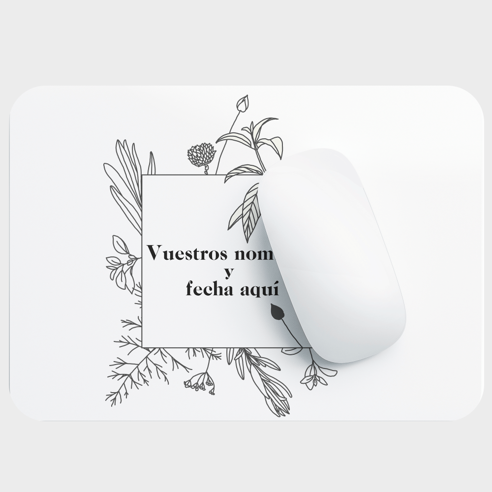 Esta alfombrilla la puedes personalizar con los nombres y la fecha de la boda. Indícanos en los comentarios los nombres y/o fecha que quieras que imprimamos. Si no nos indicas nada, imprimiremos solo la ilustración.