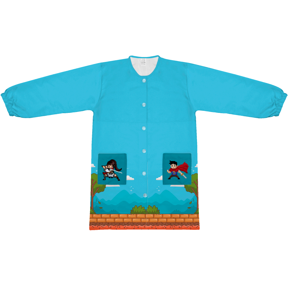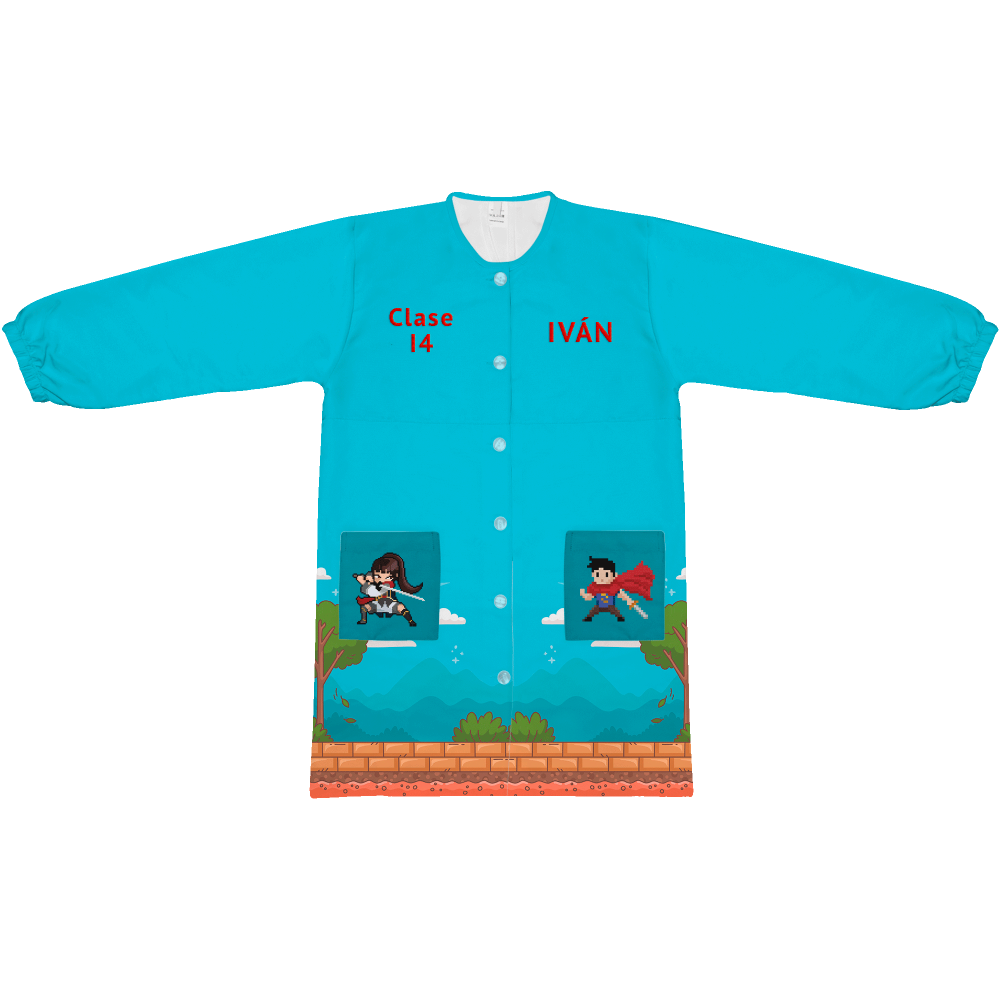 Bata escolar con cierre con botones, dos bolsillos en la parte delantera y goma en los puños