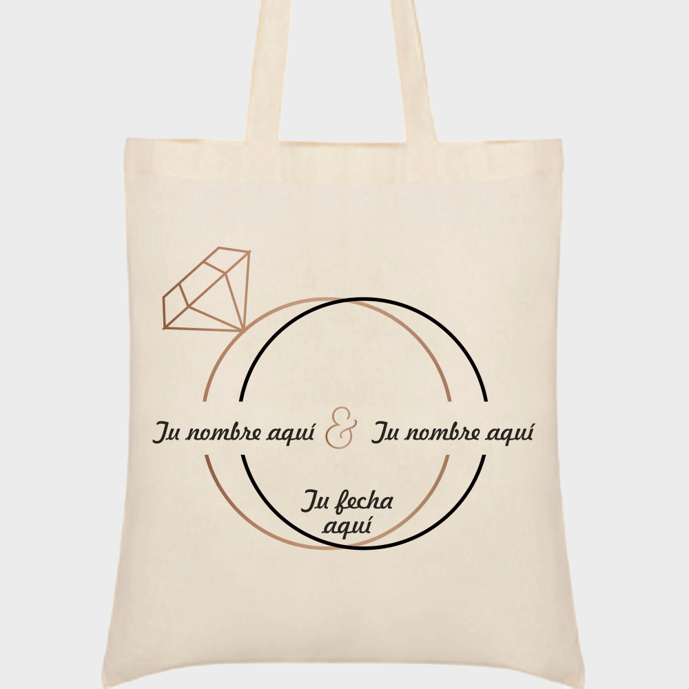 Esta bolsa de tela la puedes personalizar con los nombres y la fecha de la boda. Indícanos en los comentarios los nombres y/o fecha que quieras que imprimamos. Si no nos indicas nada, imprimiremos solo la ilustración.