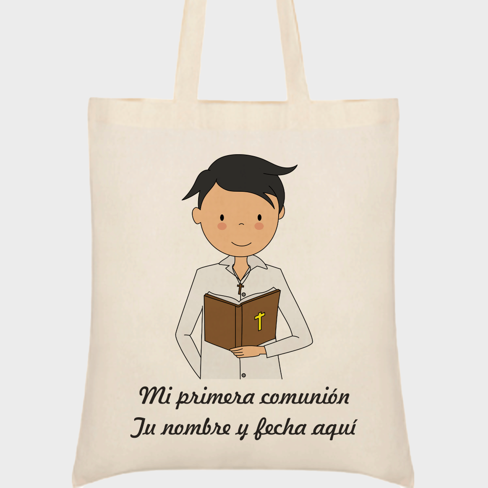 Esta bolsa de tela la puedes personalizar con el nombre y la fecha de la comunión. Indícanos en los comentarios el nombre y/o fecha que quieras que imprimamos. Si no nos indicas nada, imprimiremos solo la ilustración.