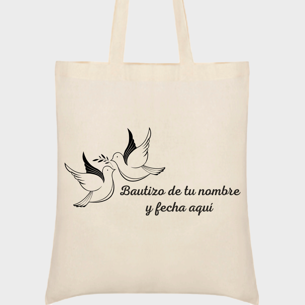 Esta bolsa de tela la puedes personalizar con el nombre y la fecha del bautizo. Indícanos en los comentarios el nombre y/o fecha que quieras que imprimamos. Si no nos indicas nada, imprimiremos solo la ilustración.