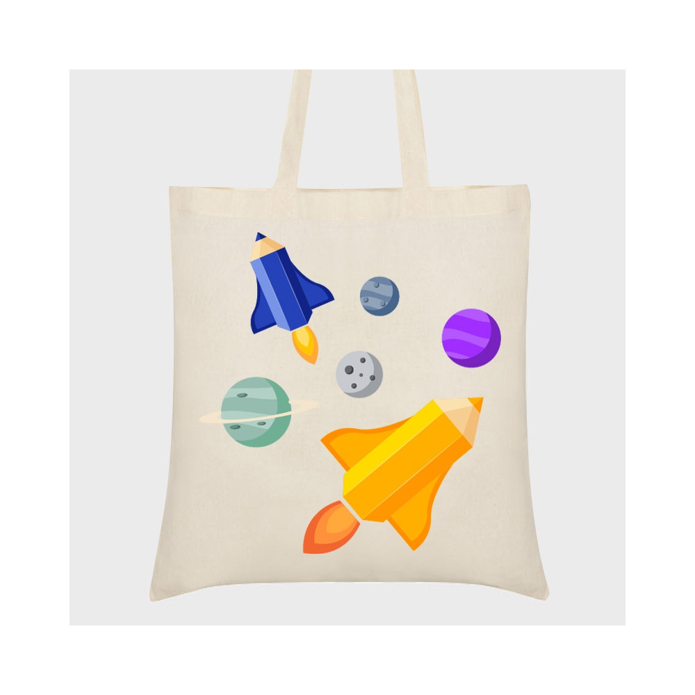 Bolsa de tela ideal para para su día a día de color natural estampada con un diseño de temática espacial.