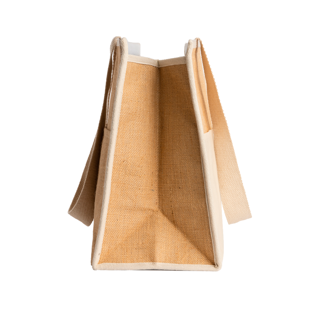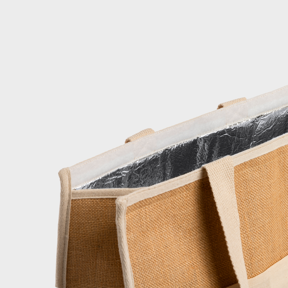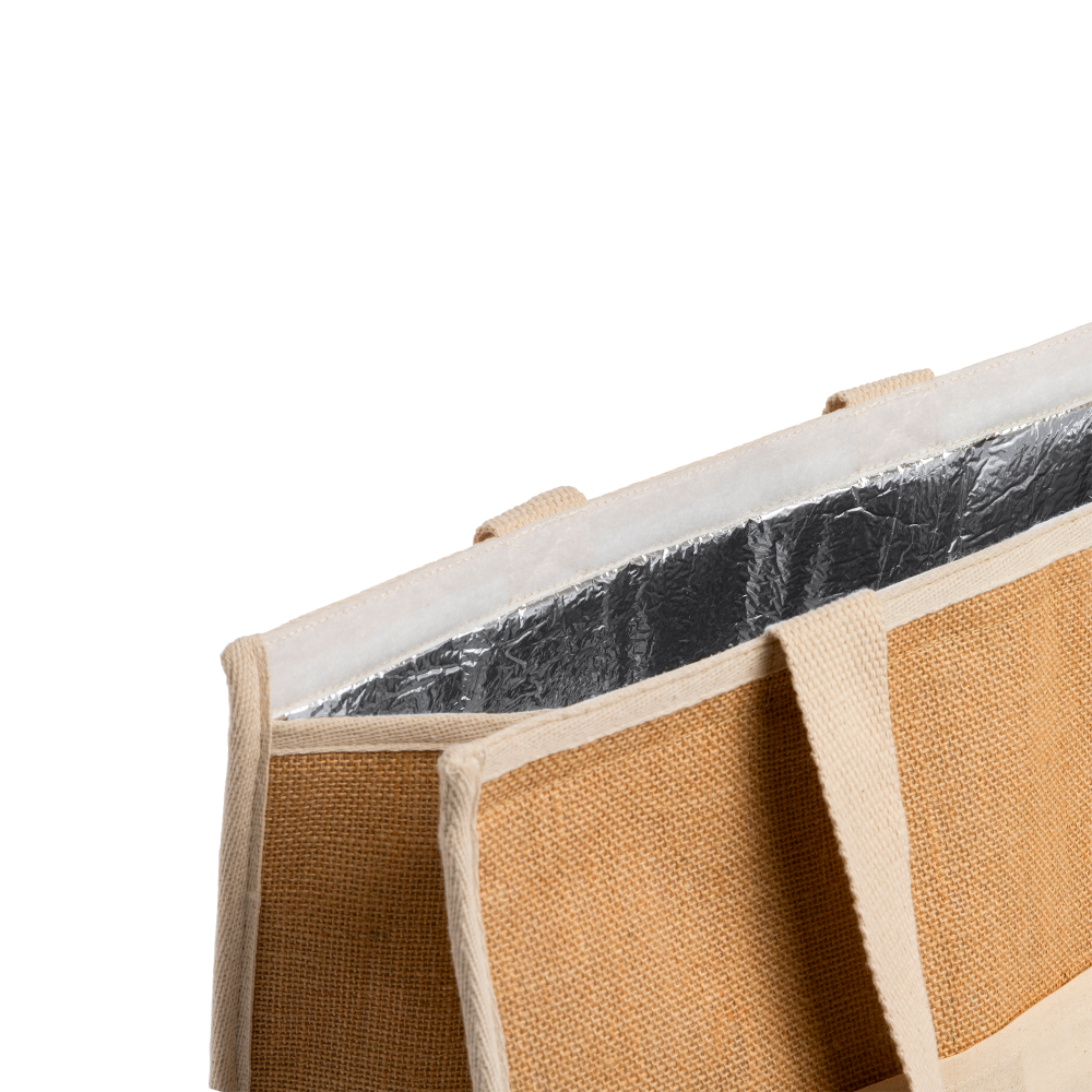 Bolsa nevera de yute laminado. Interior isotérmico de aluminio con cierre de velcro. Bolsillo frontal y asas en algodón natural.
