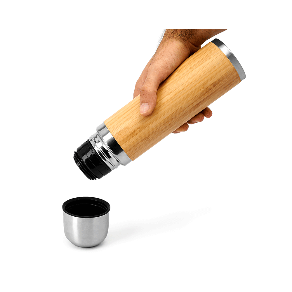 Incluye cinta para transporte y con un tapón anti goteo a rosca con función taza, también en acero inoxidable
