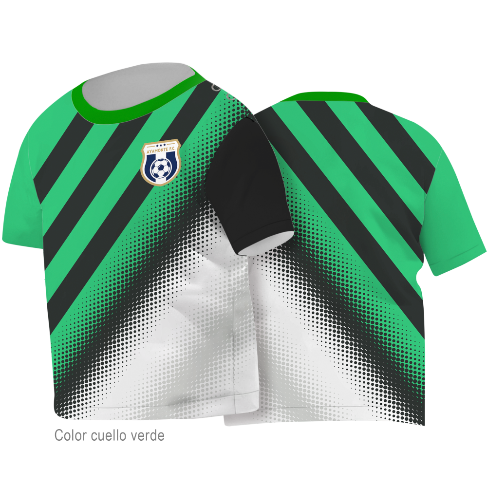 En esta prenda puedes personalizar la totalidad de la parte delantera, trasera y mangas de la camiseta. También puedes escoger el color del cuello.
