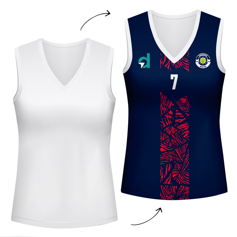Camiseta de mujer ideal para actividades como pádel o tenis. Modelo HAYA sin mangas y cuello en pico que se puede personalizar al 100% por delante y detrás. También podrás escoger el color del cuello y ribete.
