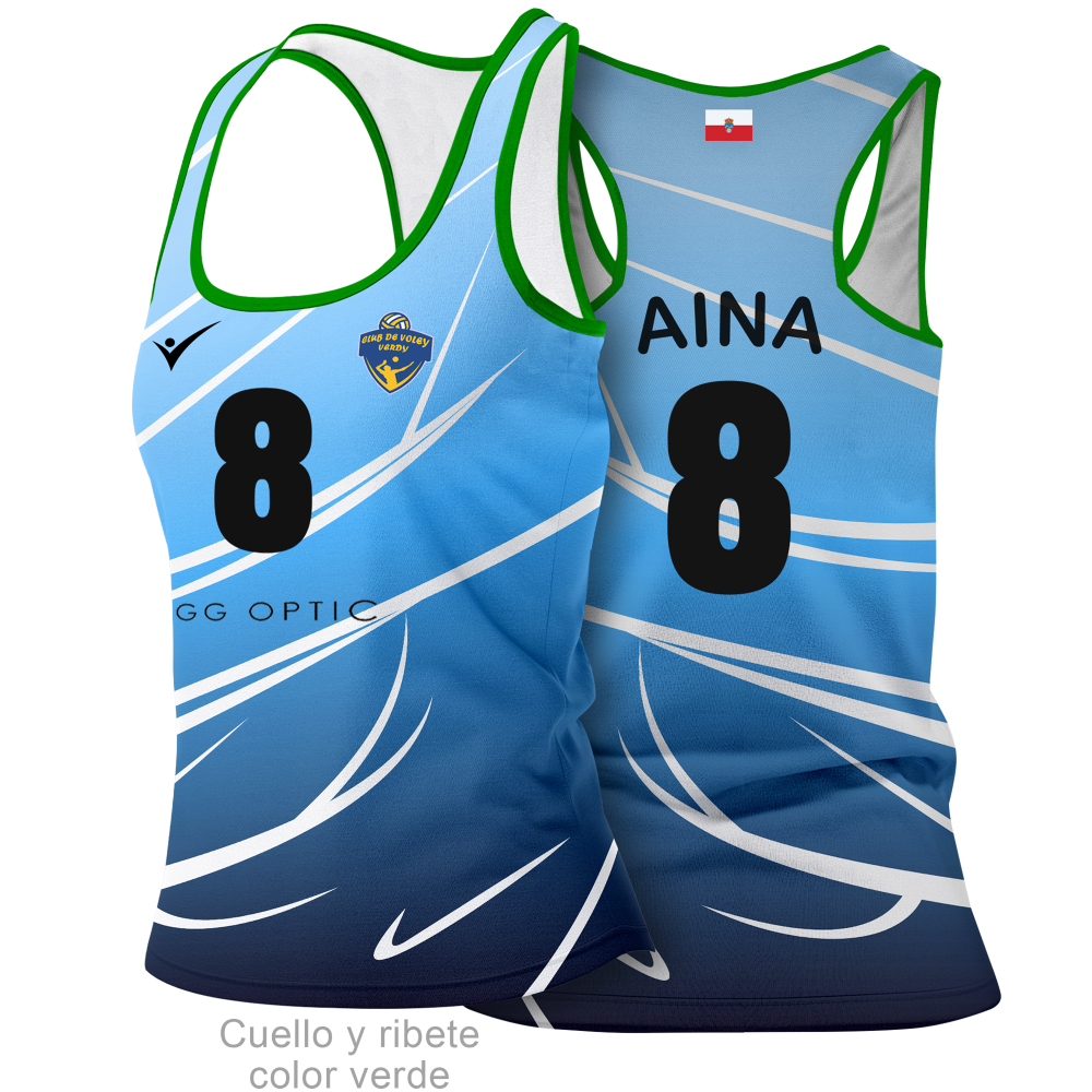 Camiseta de mujer ideal para actividades como voleibol. Modelo PARÍS de tirantes y espalda nadadora que se puede personalizar al 100% por delante y detrás. También podrás escoger el color del cuello y ribete.