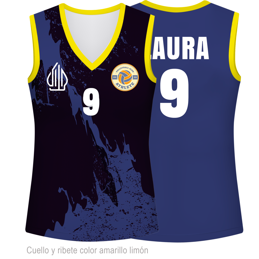 Camiseta de mujer ideal para actividades como voleibol. Modelo HAYA sin mangas y cuello en pico que se puede personalizar al 100% por delante y detrás. También podrás escoger el color del cuello y ribete.