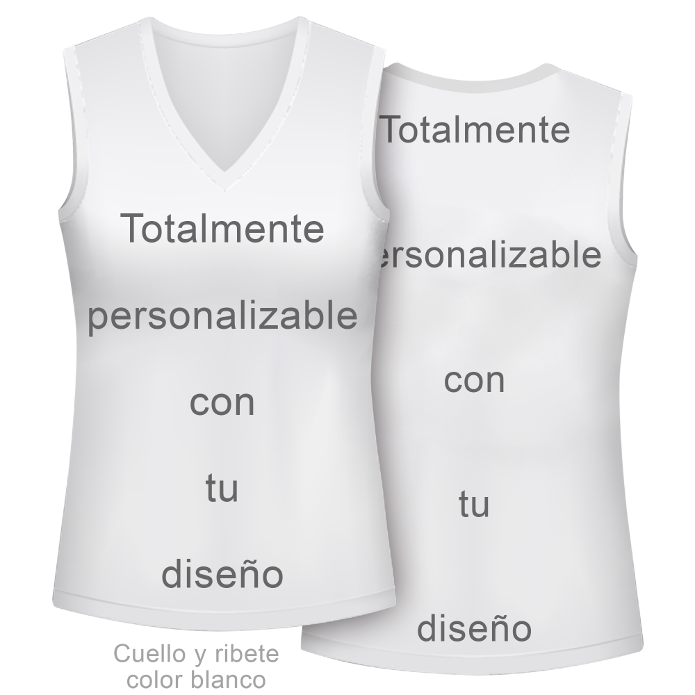 Camiseta de mujer ideal para actividades como voleibol. Modelo HAYA sin mangas y cuello en pico que se puede personalizar al 100% por delante y detrás. También podrás escoger el color del cuello y ribete.