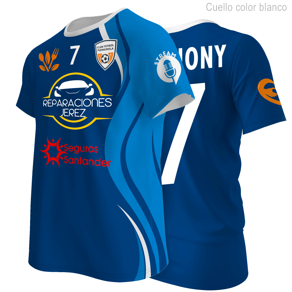 En esta prenda puedes personalizar la totalidad de la parte delantera, trasera y mangas de la camiseta. También, en el apartado Producto puedes escoger el color del cuello que desees.