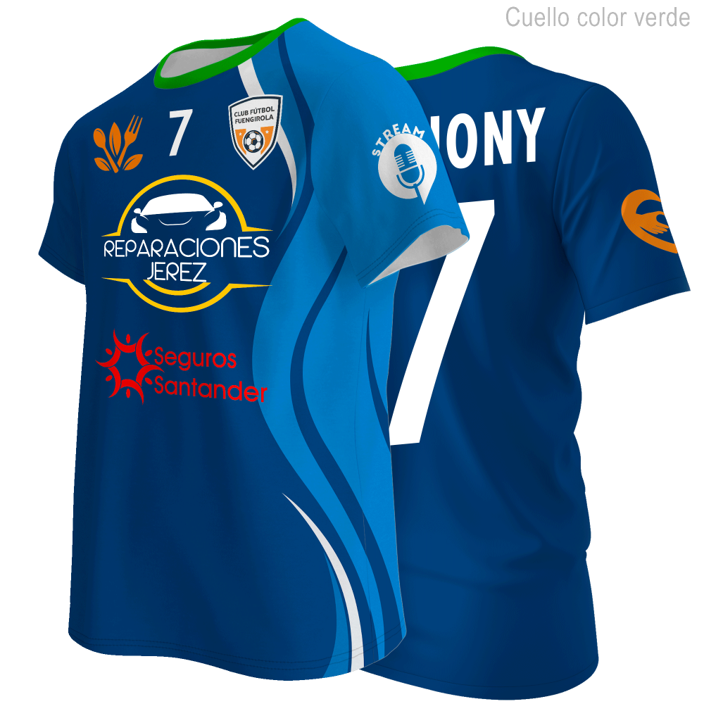En esta prenda puedes personalizar la totalidad de la parte delantera, trasera y mangas de la camiseta. También, en el apartado Producto puedes escoger el color del cuello que desees.