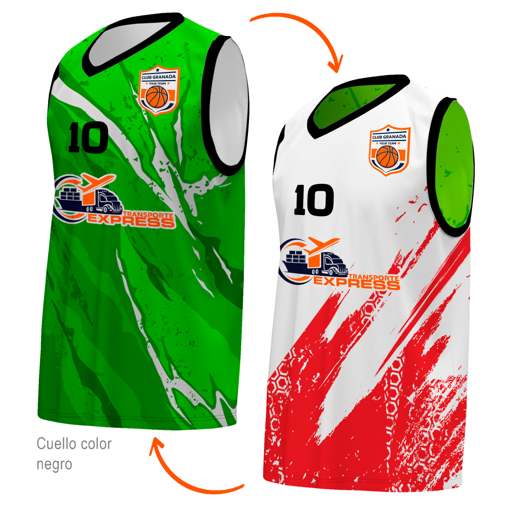 Camiseta reversible ideal para todo tipo de actividades y deportes. Modelo GRECIA sin mangas y con cuello pico contrastado que se puede personalizar al 100% por delante, detrás y cara externa e interna de la camiseta. También puedes escoger el color de cuello y ribete.