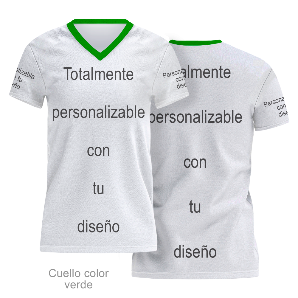 Personaliza la camiseta al 100%: delante, detrás y mangas, también, puedes escoger el color del cuello.