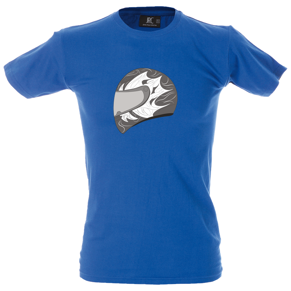 Camiseta hombre de cuello redondo con cinta de refuerzo en el cuello con diseño de casco blanco negro.