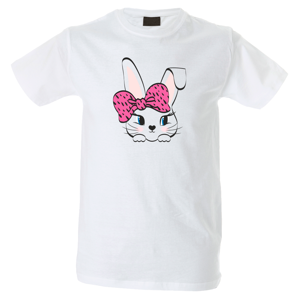 Camiseta hombre de cuello redondo con cinta de refuerzo en el cuello con diseño de conejito lazo.
