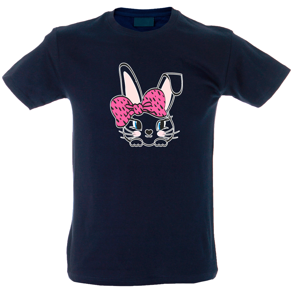 Camiseta hombre de cuello redondo con cinta de refuerzo en el cuello con diseño de conejito lazo.