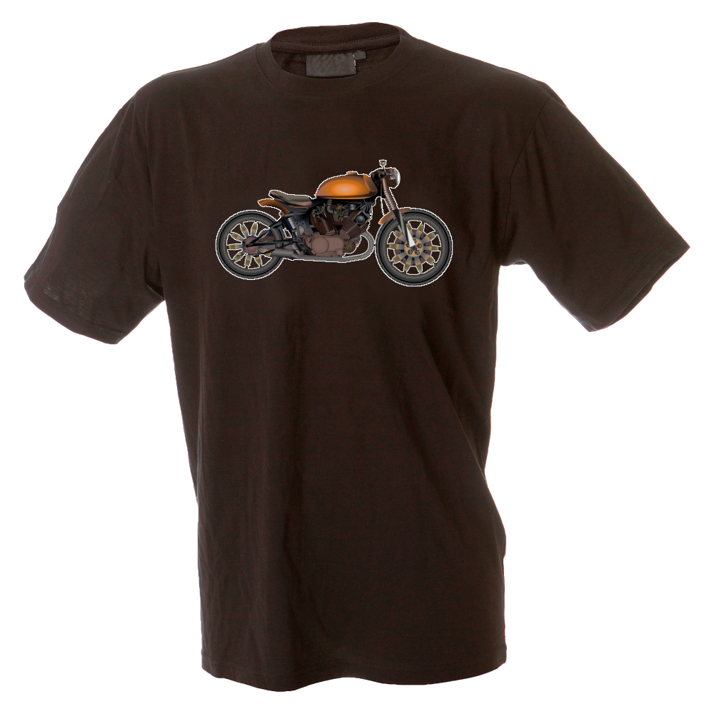Camiseta hombre de cuello redondo con cinta de refuerzo en el cuello con diseño de moto naranja