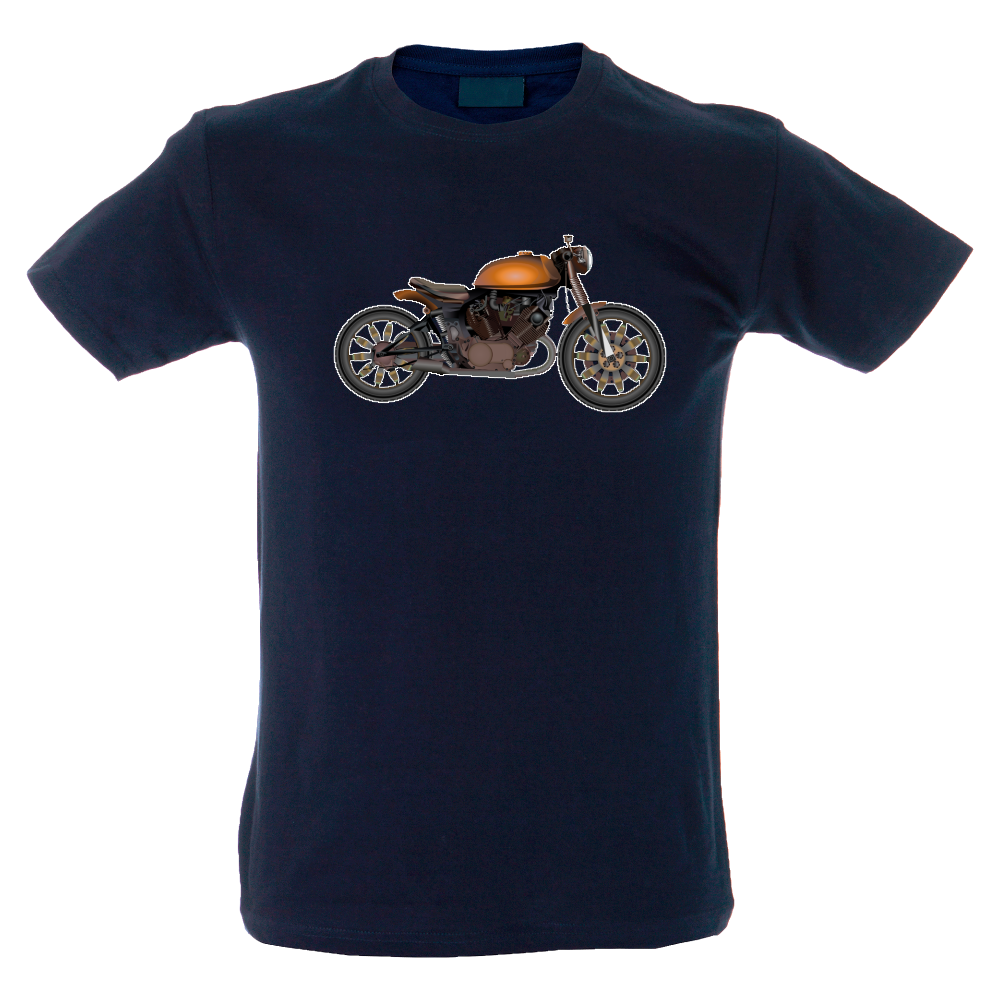 Camiseta hombre de cuello redondo con cinta de refuerzo en el cuello con diseño de moto naranja