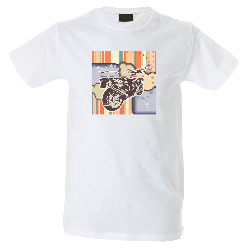 Camiseta hombre de cuello redondo con cinta de refuerzo en el cuello con diseño de moto rayada