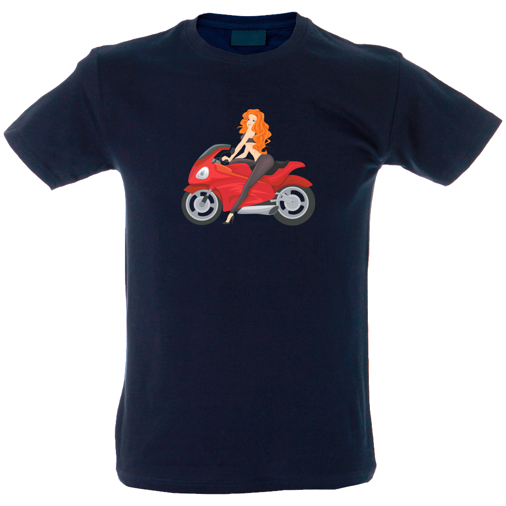 Camiseta hombre de cuello redondo con cinta de refuerzo en el cuello con diseño de mujer moto