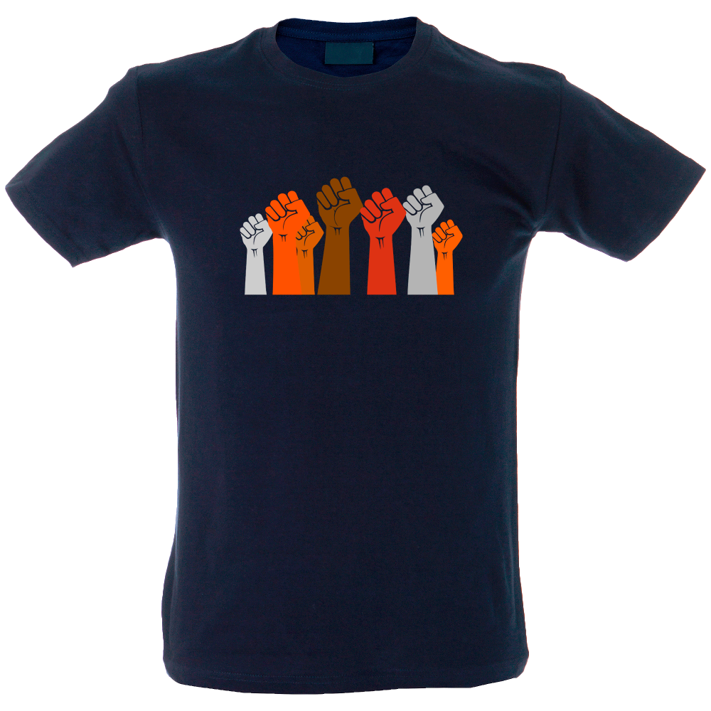 Camiseta hombre de cuello redondo con cinta de refuerzo en el cuello con diseño de puños feministas