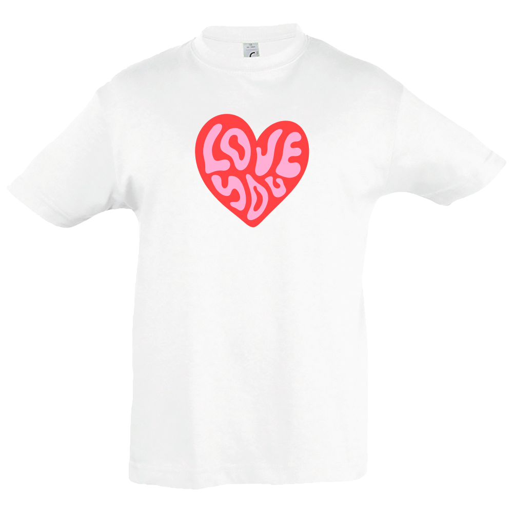 Camiseta de manga corta para niño/a con cuello redondo reforzado con diseño de love you corazón.