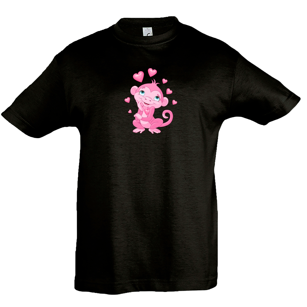 Camiseta de manga corta para niño/a con cuello redondo reforzado con diseño de mono rosa enamorado.