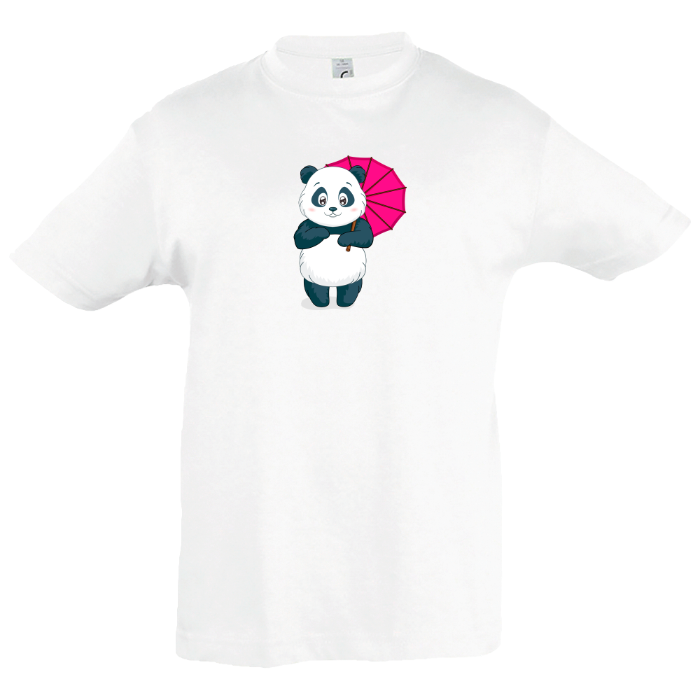 Camiseta de manga corta para niño/a con cuello redondo reforzado con diseño de panda paraguas.
