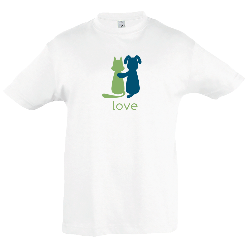 Camiseta de manga corta para niño/a con cuello redondo reforzado con diseño de perro gato enamorados.
