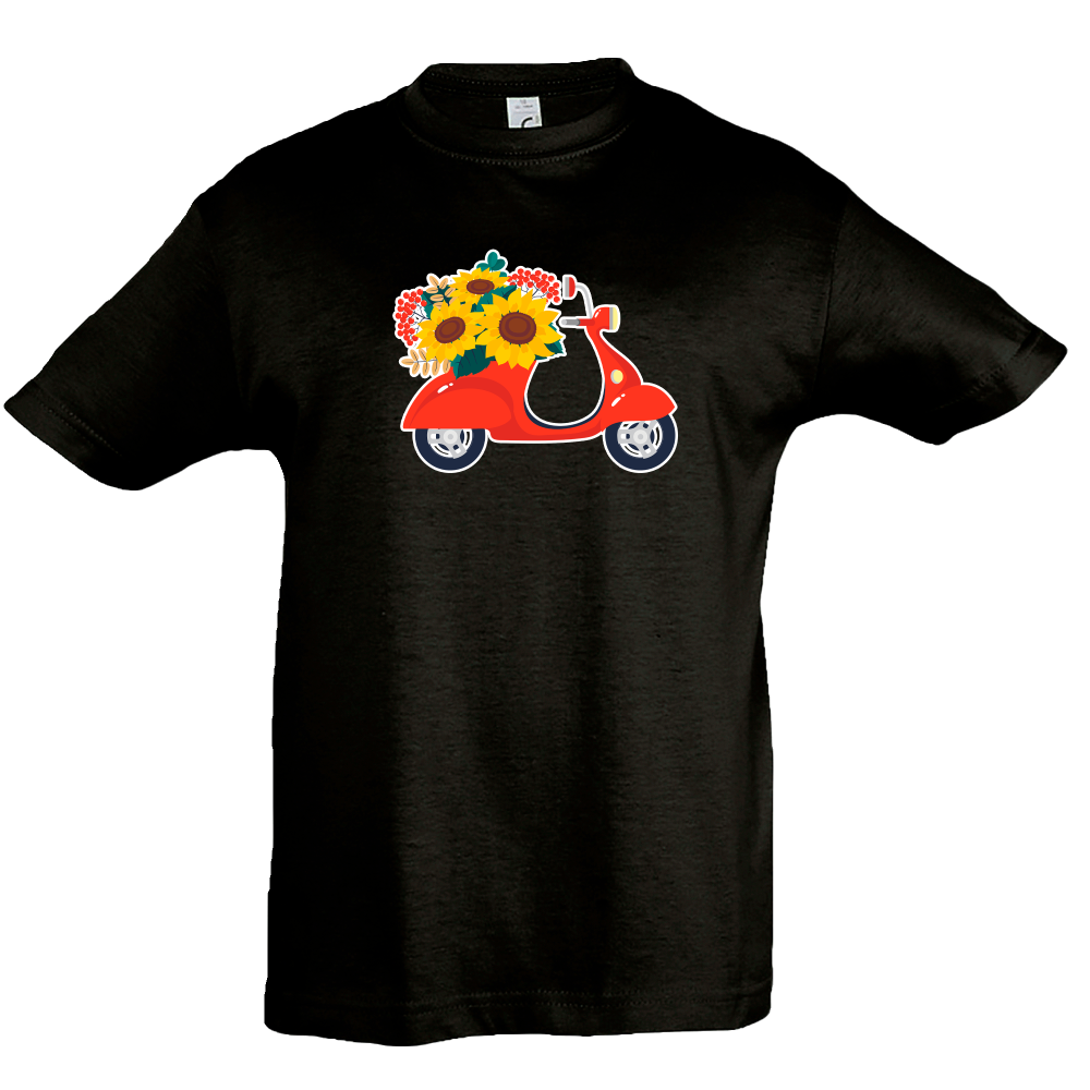 Camiseta de manga corta para niño/a con cuello redondo reforzado con diseño de vespa flores.