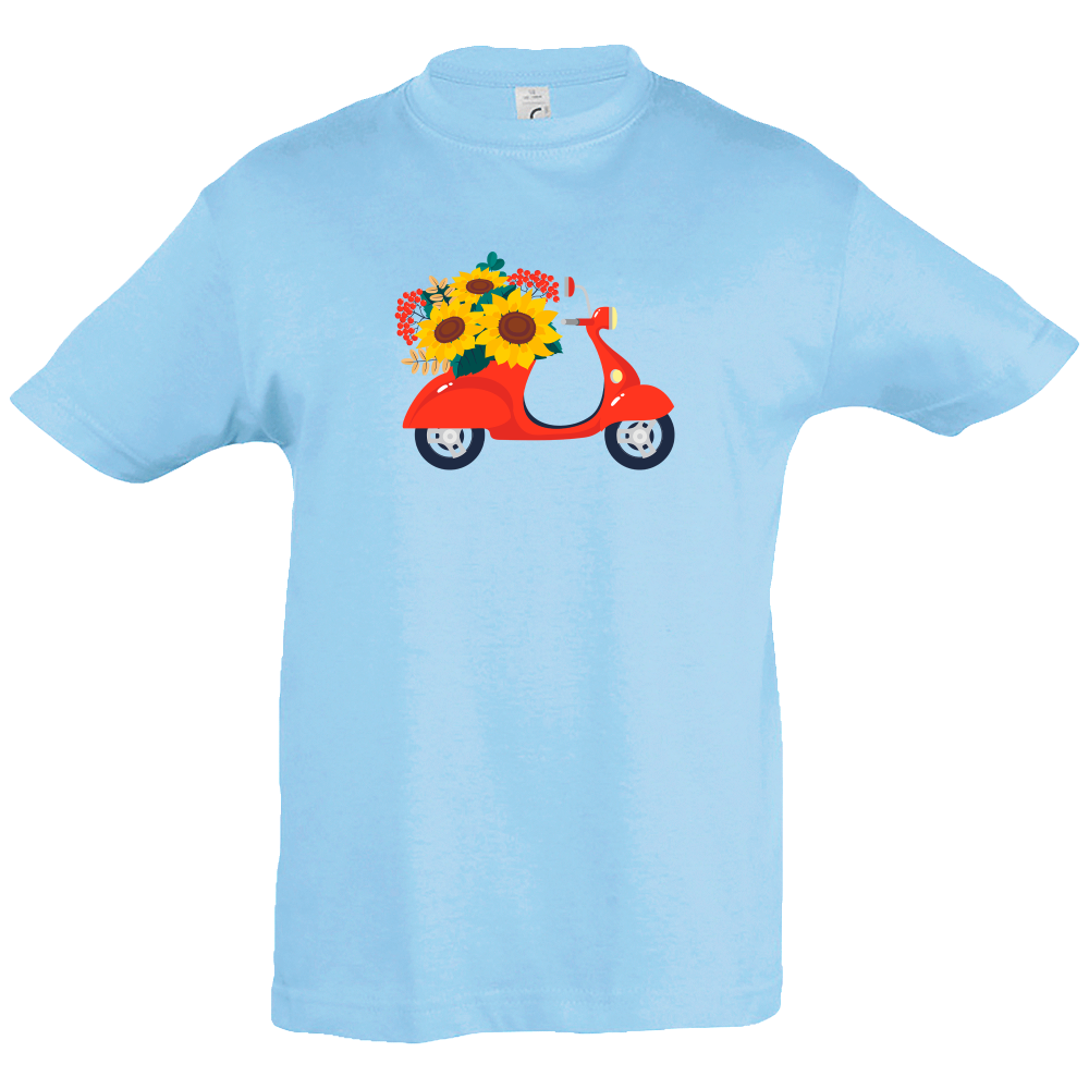 Camiseta de manga corta para niño/a con cuello redondo reforzado con diseño de vespa flores.