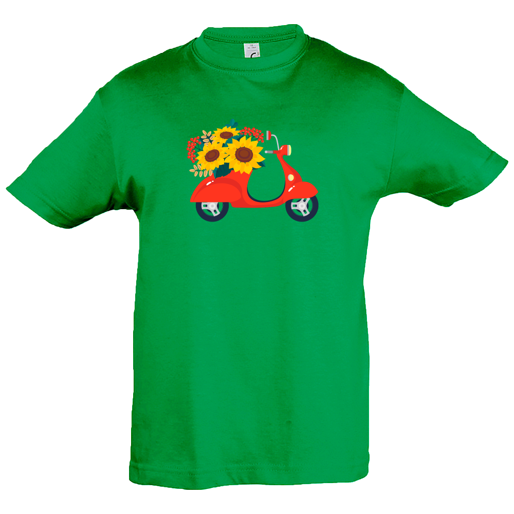 Camiseta de manga corta para niño/a con cuello redondo reforzado con diseño de vespa flores.