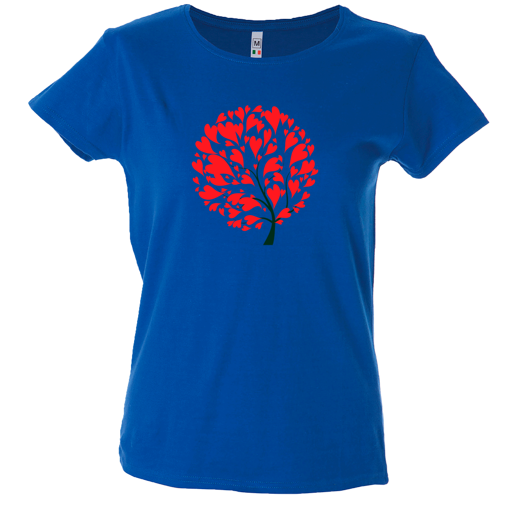 Camiseta mujer de manga corta con cinta de refuerzo en el cuello con diseño de árbol corazones