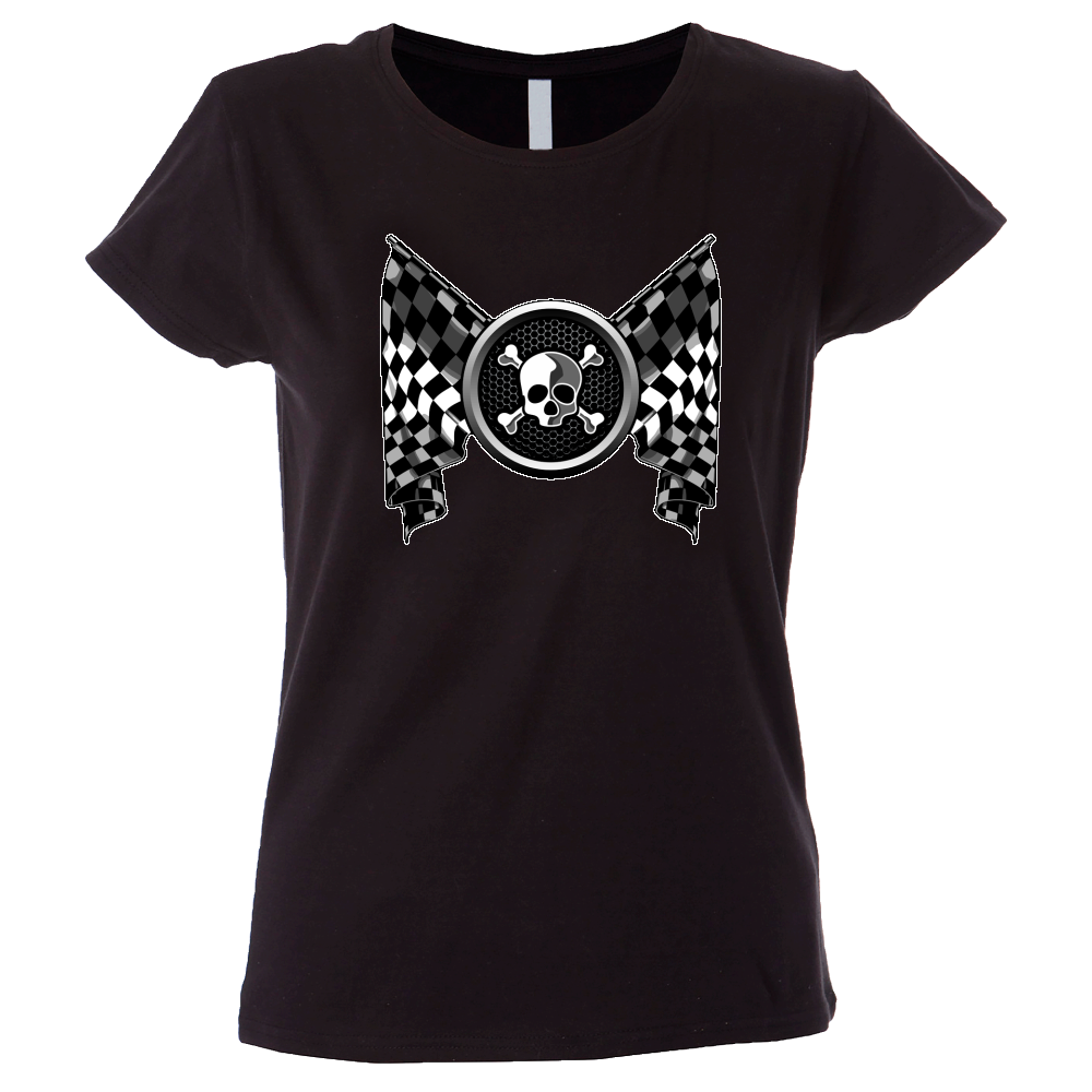 Camiseta mujer de manga corta con cinta de refuerzo en el cuello con diseño de bandera calavera