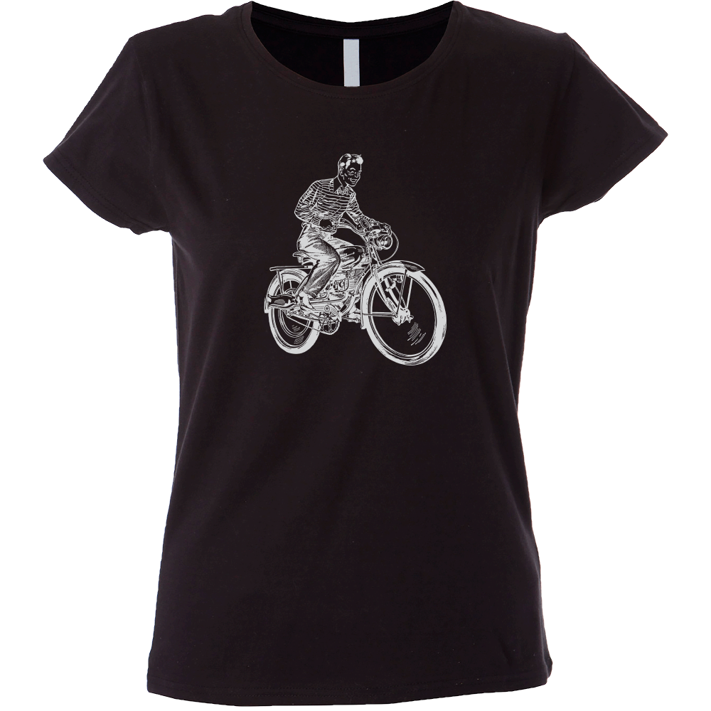 Camiseta mujer de manga corta con cinta de refuerzo en el cuello con diseño de bicicleta con motor