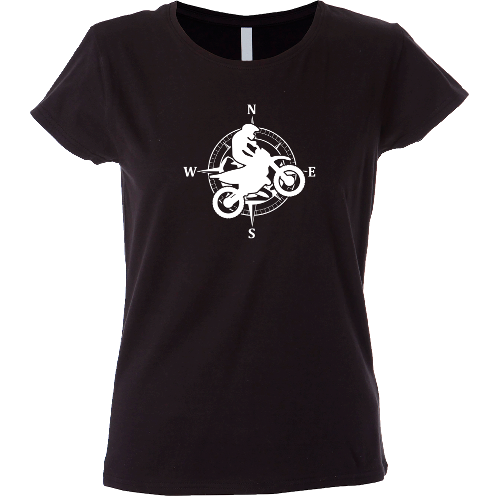 Camiseta mujer de manga corta con cinta de refuerzo en el cuello con diseño brújula motos