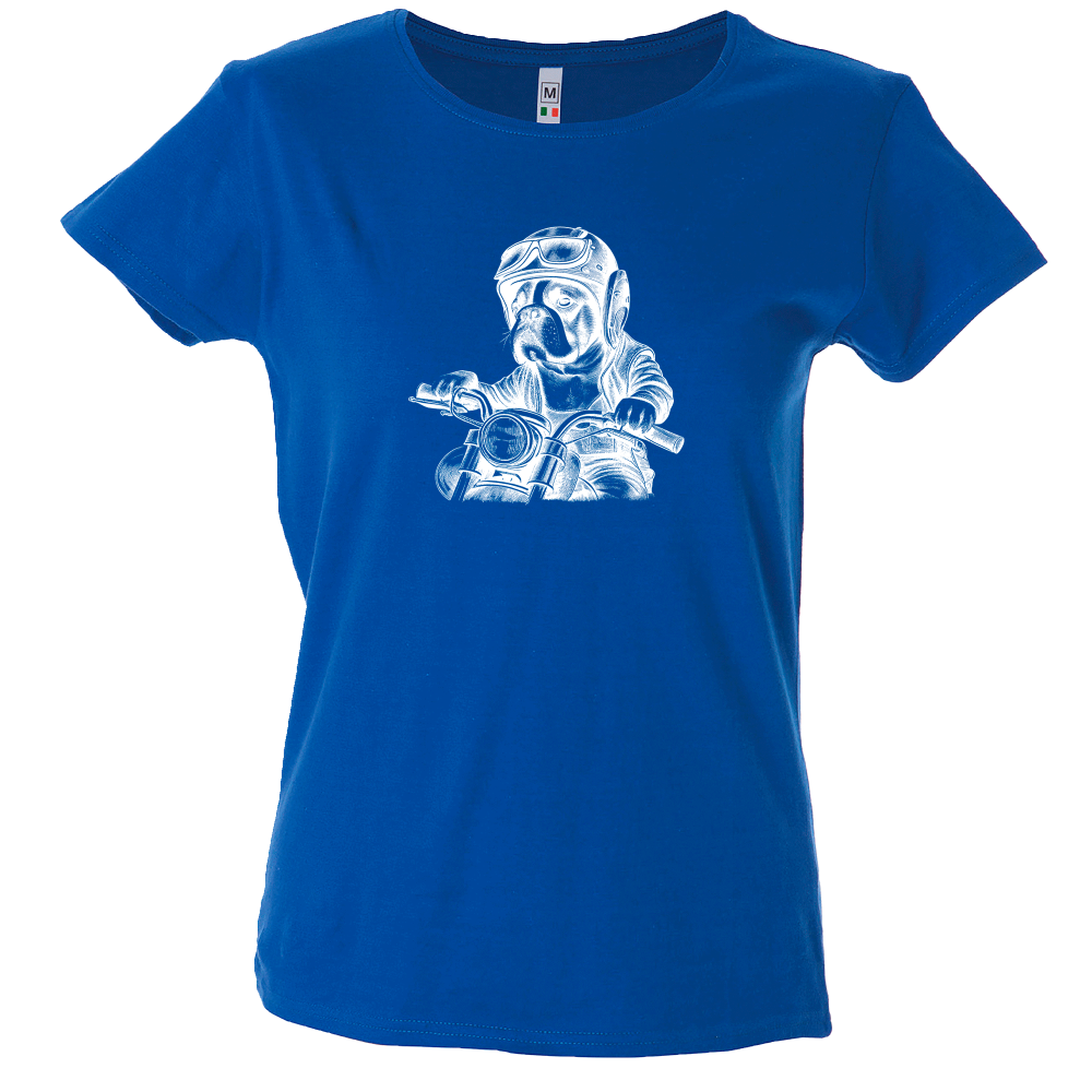 Camiseta mujer de manga corta con cinta de refuerzo en el cuello con diseño de bulldog moto