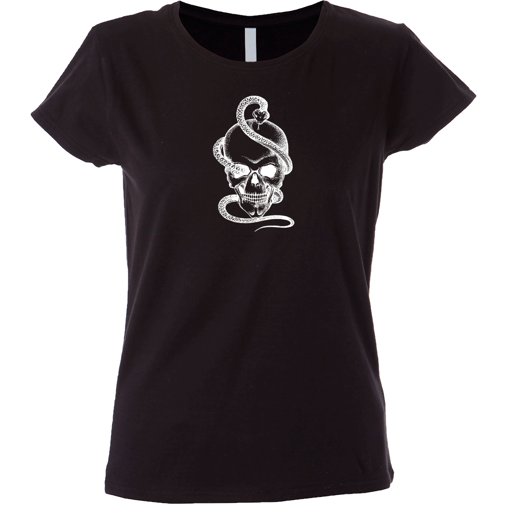 Camiseta mujer de manga corta con cinta de refuerzo en el cuello con diseño de calavera serpientes