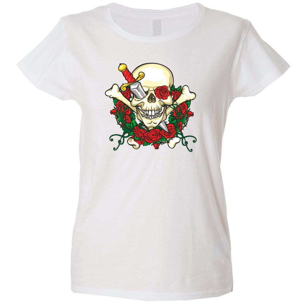 Camiseta mujer de manga corta con cinta de refuerzo en el cuello con diseño de calavera corona rosas