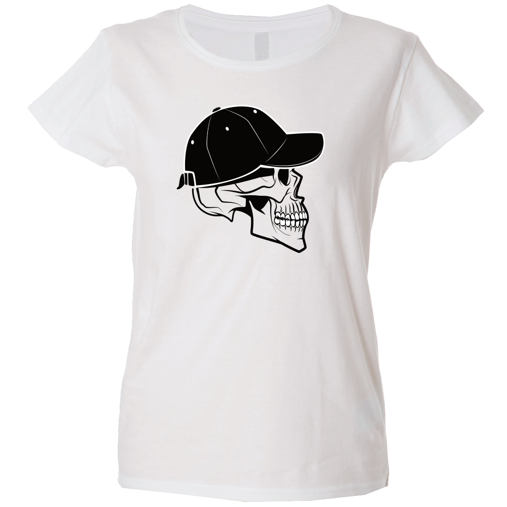 Camiseta mujer de manga corta con cinta de refuerzo en el cuello con diseño de calavera gorra