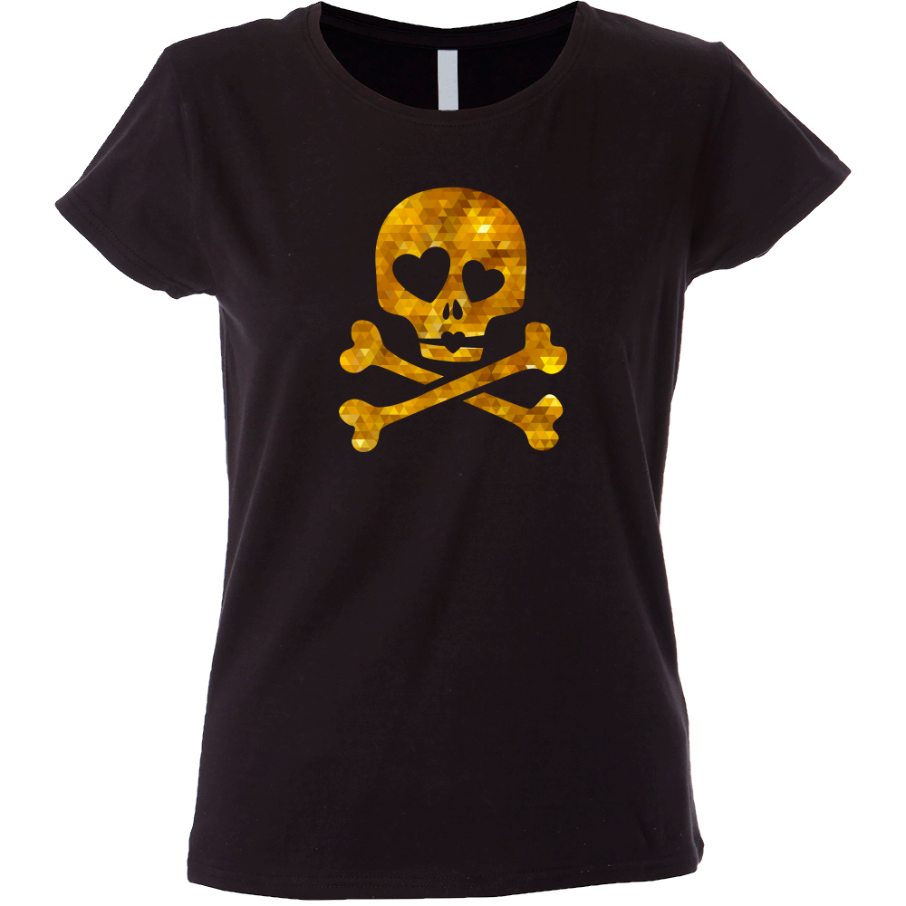 Camiseta mujer de manga corta con cinta de refuerzo en el cuello con diseño de calavera ojos corazones