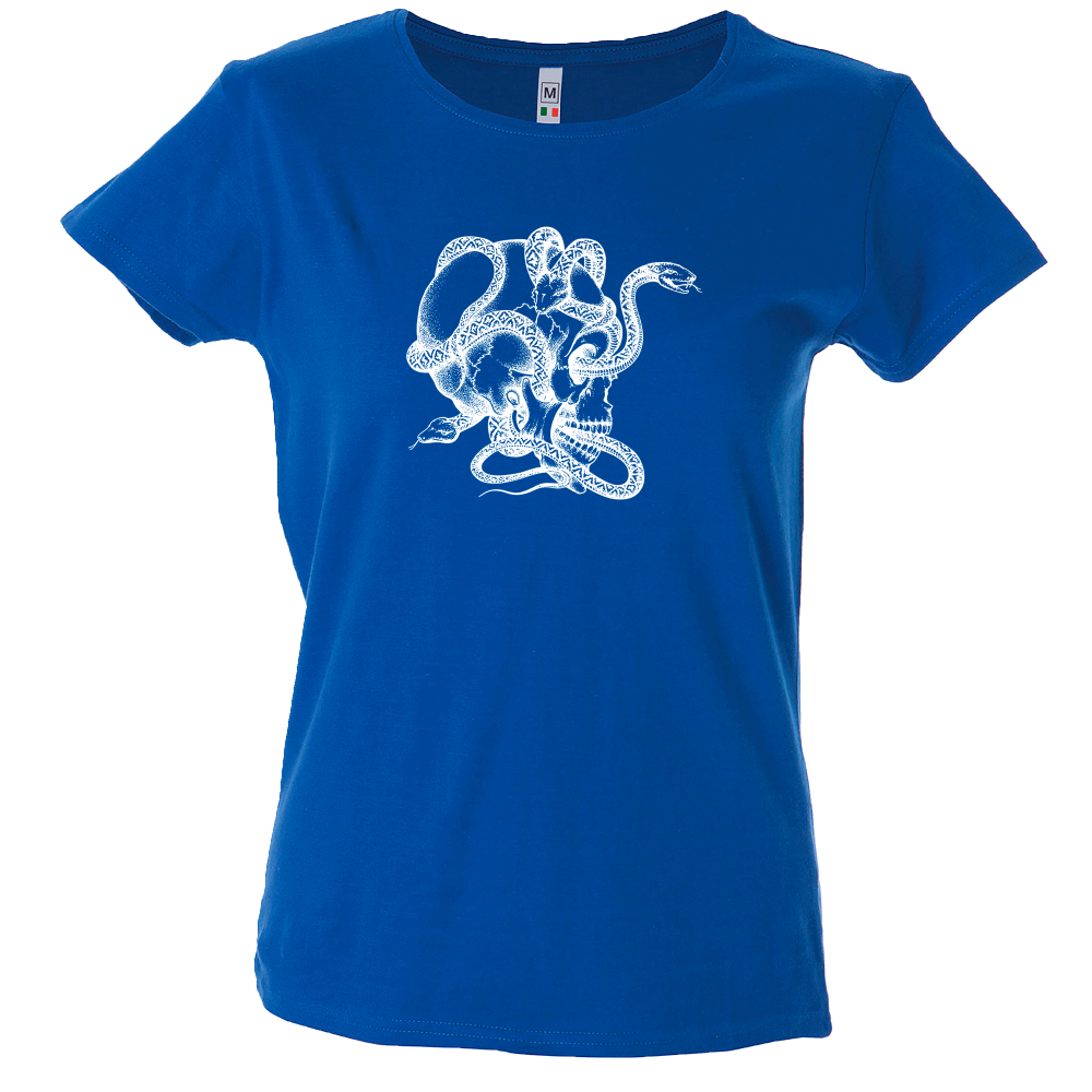 Camiseta mujer de manga corta con cinta de refuerzo en el cuello con diseño de calavera tres serpientes.