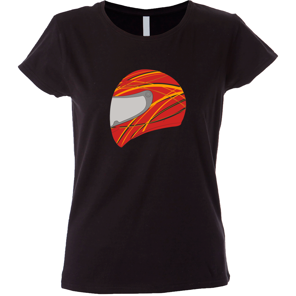 Camiseta mujer de manga corta con cinta de refuerzo en el cuello con diseño de casco rojo.