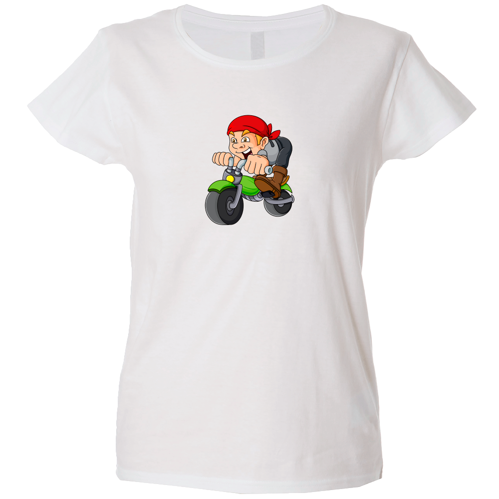 Camiseta mujer de manga corta con cinta de refuerzo en el cuello con diseño de dibujo moto