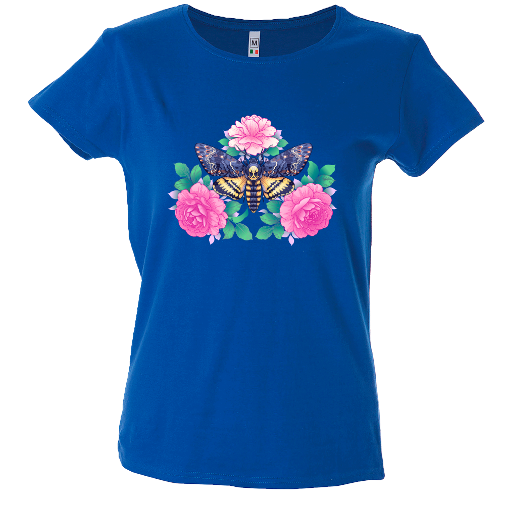 Camiseta mujer de manga corta con cinta de refuerzo en el cuello con diseño de mariposas