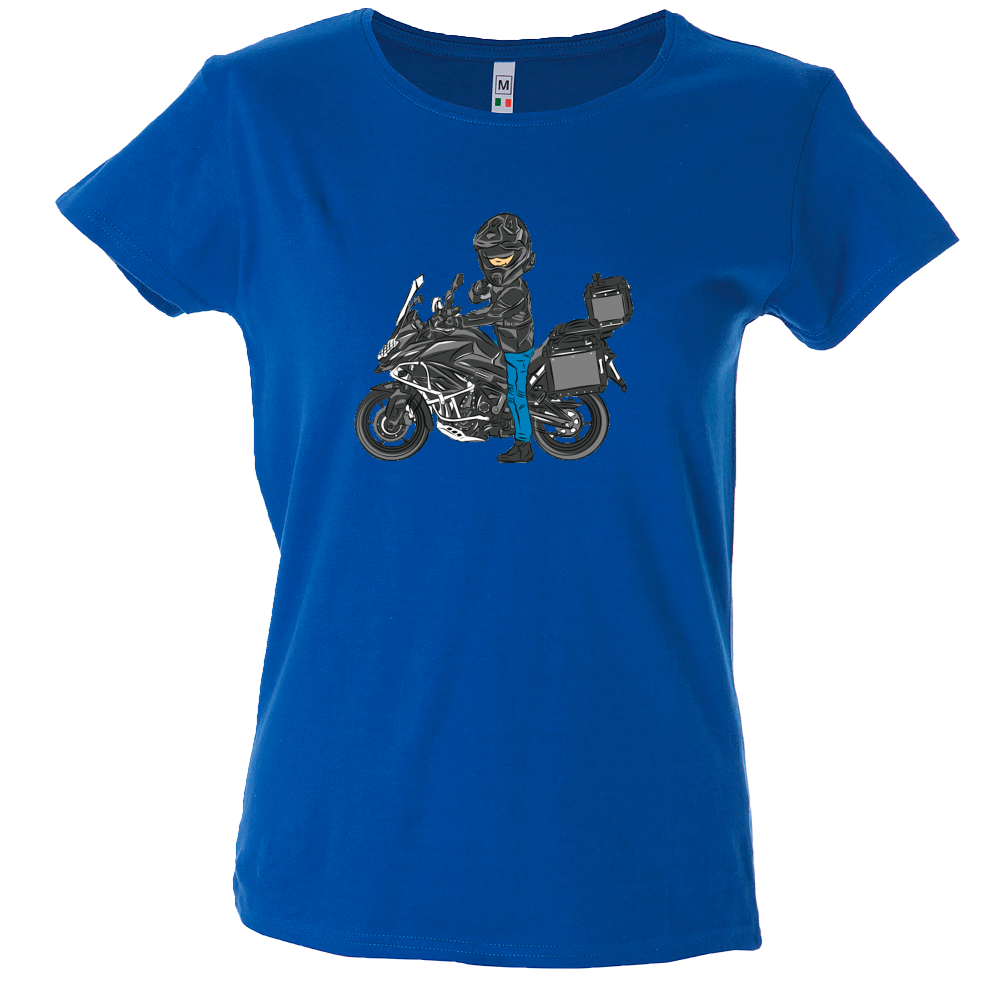 Camiseta mujer de manga corta con cinta de refuerzo en el cuello con diseño de motero posando